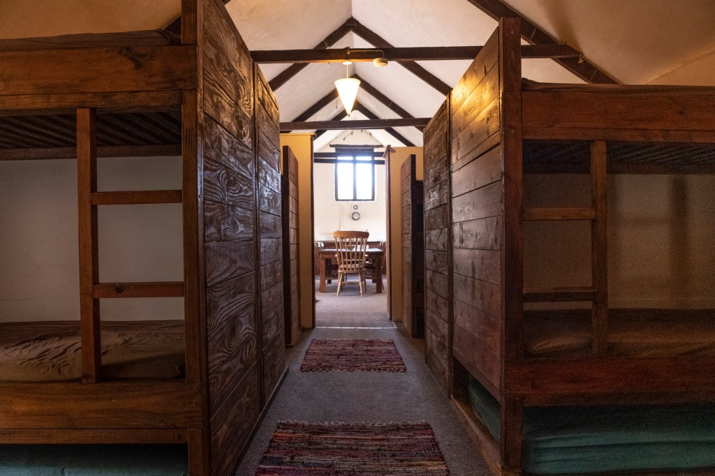 A dormitory style open plan barn with bunks, two bathrooms, with showers, a kitchen and seating area.